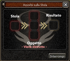 In caso di fallimento, la stola inserita nel secondo slot verrà distrutta ed in caso di successo, le due stole utilizzate per la fusione verranno sostituite da una stola del grado successivo.